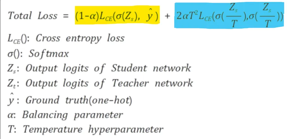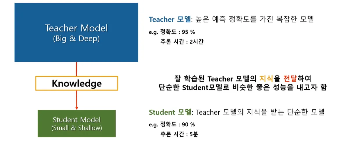 정의: 큰 네트워크(Teacher 모델)로부터 작은 하나의 네트워크(Student 모델)에 지식을 전달하는 기법. 즉 복잡한 모델이 학습한 generalization 능력을 단순한 모델에게 transfer 해주는 것이다.